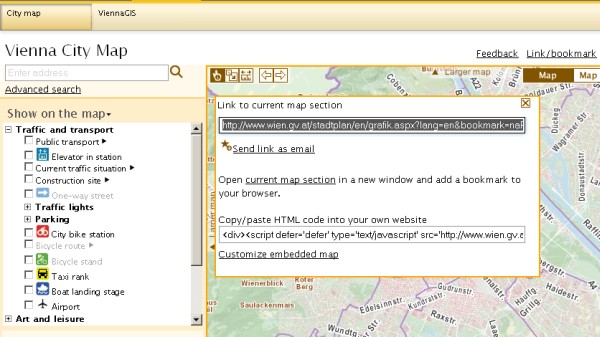 Creating a link to a specific section of the wien.at City Map is very easy. You can then embed the link in another website, bookmark it in your web browser, or send it by e-mail.