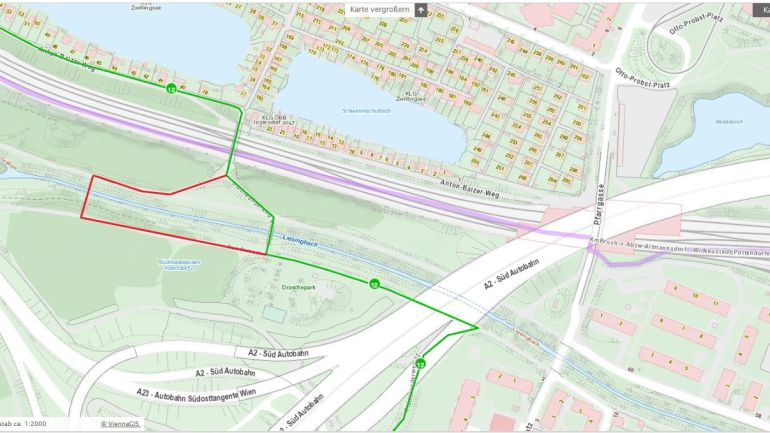 Die Umleitung verläuft nach dem Draschepark weiter Richtung Westen bis zur nächsten Brücke über den Liesingbach. Danach rechts, um wieder zur ursprünglichen Route des Stadtwanderweges zu gelangen.