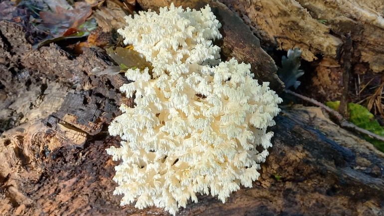- Stacheln/Äste: mit aufwärtsgerichteten, korallenartig und reich verzweigten Ästen, die aus einem gemeinsamen Strunk hervorgehen, jung bärtig, bei alten Fruchtkörpern hängen die Stacheln herab