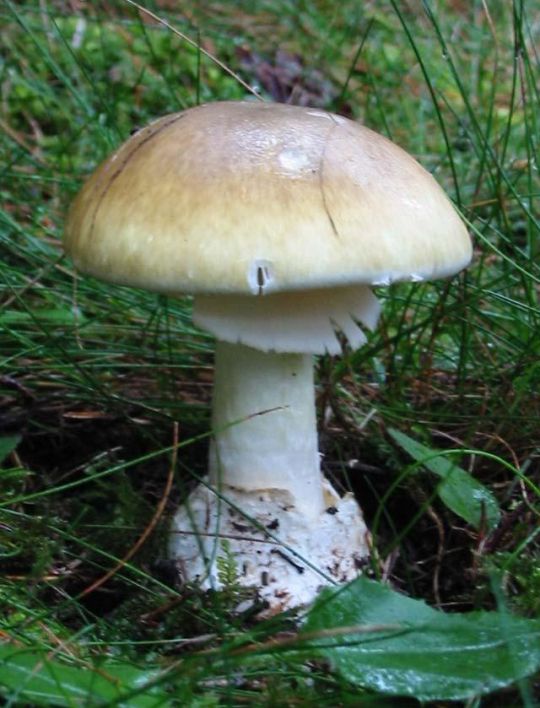 - Hut: grün, grünweißlich, grüngelblich, olivgrün, olivgelb, manchmal auch ins Olivbraune gehend, jung in eiförmigem Zustand, jung auch weiß und teilweise mit Resten der weißen Gesamthülle, erst halbkugelförmig, später aufschirmend, fein radial faserig eingewachsen, ungeriefter Rand, Huthaut lässt sich dreiecksförmig (tortenstückartig) abziehen