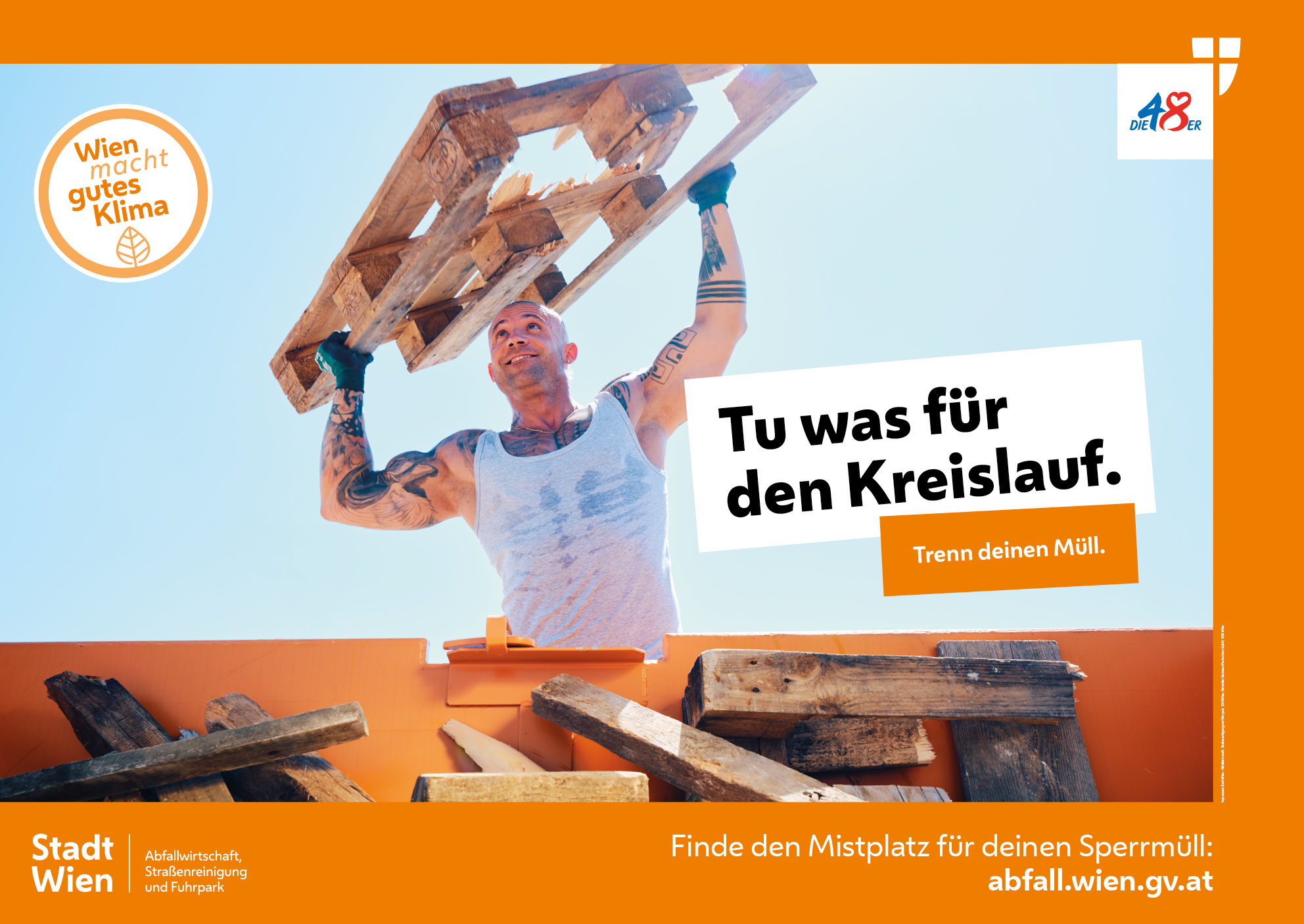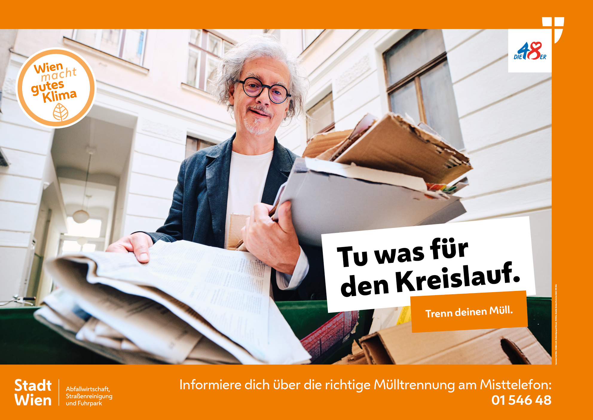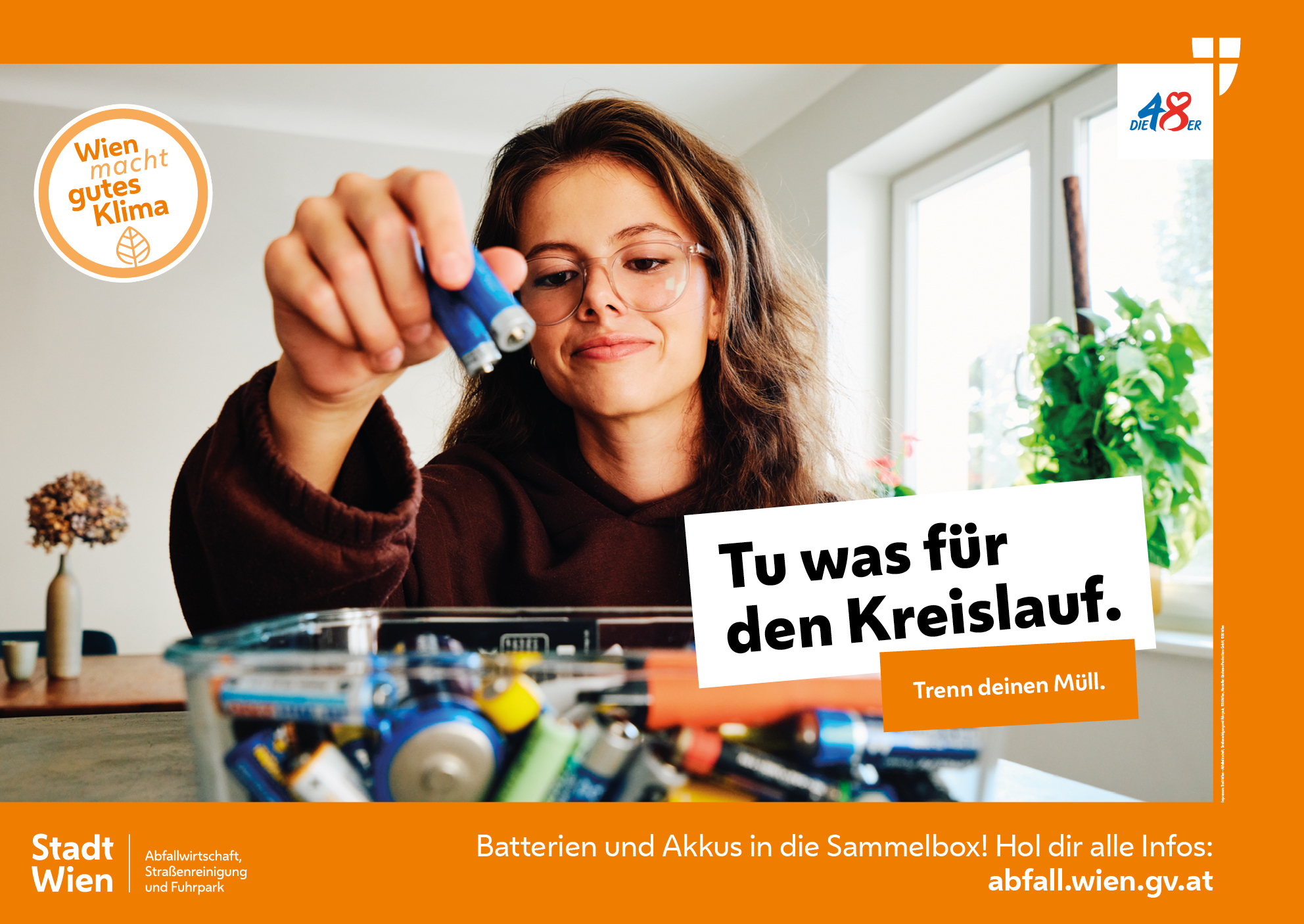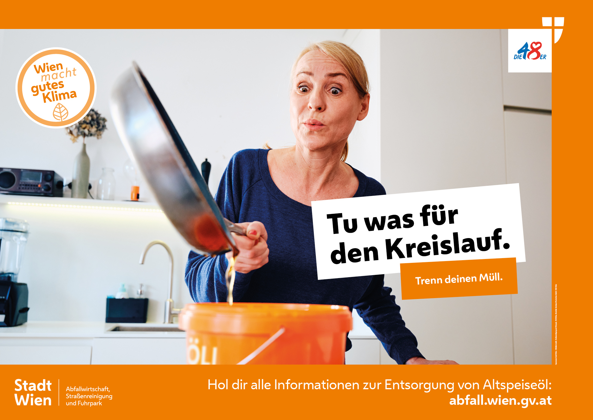 Die neue Kampagne der Abteilung Abfallwirtschaft, Straßenreinigung und Fuhrpark (MA 48) lautet "Tu was für den Kreislauf - trenn deinen Müll". Im Mittelpunkt stehen 4 Sujets, die stellvertretend zeigen, wie wichtig richtige Trennung ist: Altspeiseöl, Batterien, Papier und Karton sowie Sperrmüll.