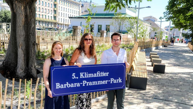 Unter der Devise "Hitze raus - Natur rein!" verwandelte sich eine bisher graue und teilweise asphaltierte Fläche unmittelbar bei der U-Bahn-Station Kettenbrückengasse zur schattigen Aufenthaltsoase. Auf über 1.500 Quadratmetern eröffnete nach nur 5-monatiger Bauzeit im Juli 2025 an der Rechten Wienzeile der Barbara-Prammer-Park - eine begrünte Freifläche mit 14 neuen Bäumen zusätzlich zu den bestehenden 8, großzügigen Gräserbeeten, bequemen Sitzmöglichkeiten und Wasserspielen.