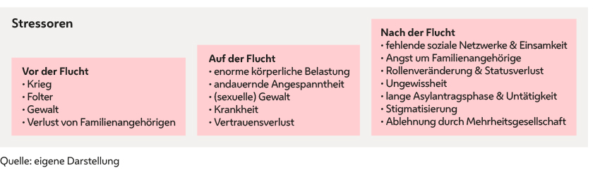 Die Erfahrungen von Krieg, Flucht und Resettlement sind individuell sehr unterschiedlich und bergen zahlreiche Risikofaktoren für physische wie psychische Erkrankungen, die sich in Dauer und Intensität erheblich unterscheiden können. Stressfaktoren vor der Flucht, die häufig in einem von Krieg oder gewaltsamen Konflikten betroffenen Land auftreten, umfassen persönliche oder indirekte Erfahrungen von Gewalt und Folter, Inhaftierung und Körperverletzung sowie den Verlust von (nahen) Familienangehörigen (Elbert et al. 2013; Ertl et al. 2011). Durch geschlechtsspezifische Gewalt, einschließlich, aber nicht beschränkt auf Vergewaltigung und sexuelle Übergriffe, entwickeln weibliche Geflüchtete psychische und somatische Störungen, die zu nachhaltigen gesundheitlichen Einschränkungen führen können (Paras et al. 2009). Unterernährung, wirtschaftliche Not, inklusive eines Mangels an den grundlegendsten Ressourcen des täglichen Lebens, Verlust von Eigentum, extreme Angst oder der Zwang, anderen Gewalt anzutun bzw. zu bezeugen, sind weitere Stressoren für die mentale, emotionale und physische Gesundheit von Geflüchteten vor ihrer eigentlichen Flucht (Abbott 2016). Obwohl diese Faktoren selten als Stressoren für bereits angekommene Flüchtlinge genannt werden, die sich in körperlicher Sicherheit befinden, können diese und ähnliche Erfahrungen noch lange nach dem Ereignis nachwirken (Kohlbacher/Six-Hohenbalken 2019).
