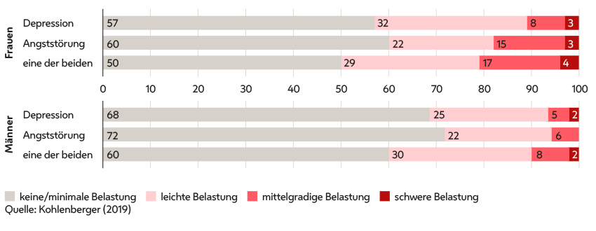 Für die Fluchtbewegung ab 2015 verdeutlichen Querschnittserhebungen, dass Frauen besonders hohe Levels an mittelgradigen bis schweren Angststörungen und Depressionen zeigen (Kohlenberger et al. 2019; Abb. 2). Dies ist unter anderem ausgeprägten Verlustängsten, geänderten Rollenbildern und chronischem (Akkulturations-)Stress geschuldet, aber auch den davor skizzierten Risikofaktoren während der Flucht.