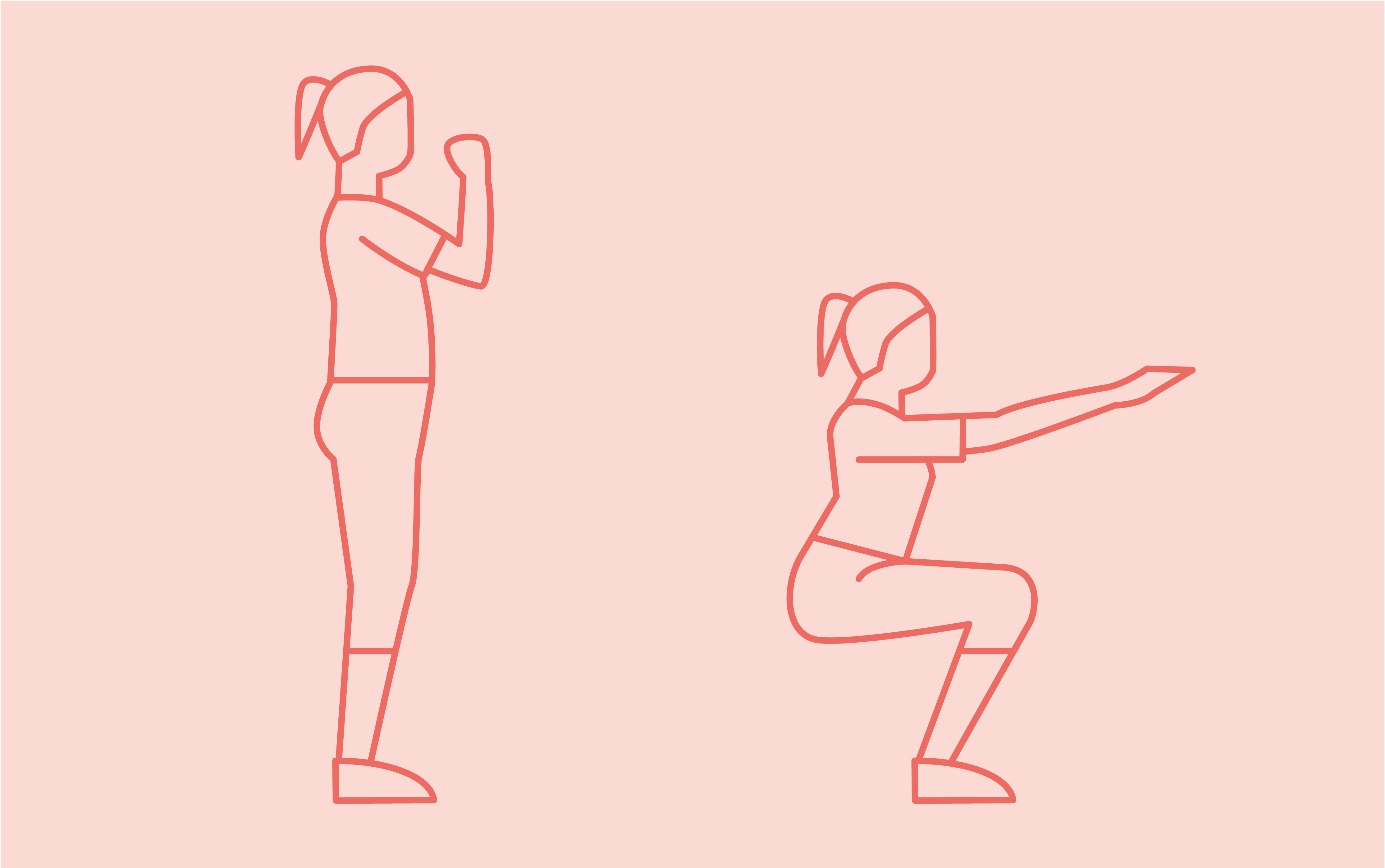 Her iki ayağınız da yere sağlam basacak şekilde durun. Ayaklar kalça genişliğinde açık olmalıdır. Ayak uçları hafifçe dışarı doğru bakmalıdır. Arkanızda olan bir sandalyeye oturduğunuzu düşünün. Kollarınızı öne doğru uzatın. Ayağa kalkarken bacaklarınızı ve kalçanızı gerin. Ayağa kalkarken nefes alın, otururken nefes verin.
