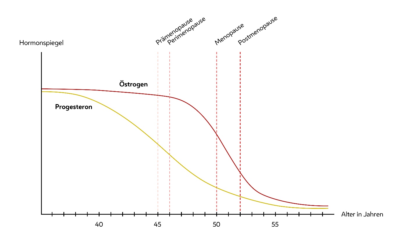 Die Wechseljahre sind ein Prozess, der in verschiedenen Phasen abläuft: Die Abbildung zeigt, welche Phasen es gibt. Wir sehen, dass die Hormone Östrogen und Progesteron ab dem 40. Lebensjahr der Frau weniger werden. Schauen wir uns an, was die einzelnen Phasen für uns bedeuten und wie wir damit umgehen können.