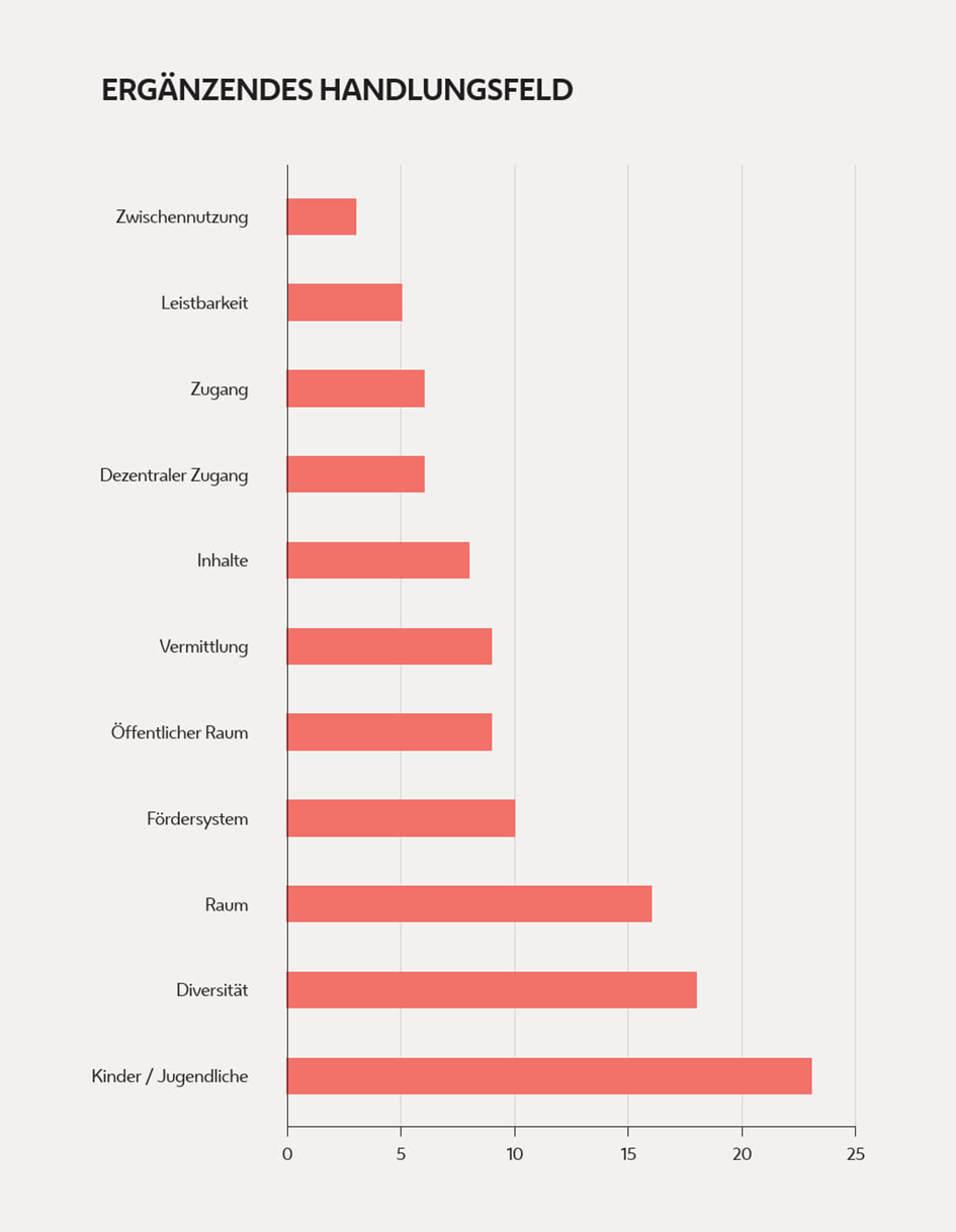 Die Auswertung der Antworten zeigt ein deutliches Gewicht auf der Verstärkung von kulturellen Angeboten für Kinder- und Jugendliche als zusätzliches Handlungsfeld. Am zweithäufigsten war die Erwähnung von Maßnahmen, die die Diversität auf allen Ebenen und in Bezug auf verschiedene Gruppen der Gesellschaft stärker widergespiegelt sehen möchten – Forderung zur Erhöhung des Frauenanteils, Angebote für Menschen mit unterschiedlichen sozioökonomischen und Bildungshintergründen, eine stärkere Einbeziehung von Menschen mit Migrationshintergrund – auf, vor und hinter der Bühne. Zusammen mit dem Wunsch nach mehr Vermittlungsangeboten, der im Mittelfeld der Antworten liegt, wird hier das Bedürfnis nach einer Verbreiterung des Angebots, aber auch nach der Ansprache von verschiedenen Publika artikuliert.