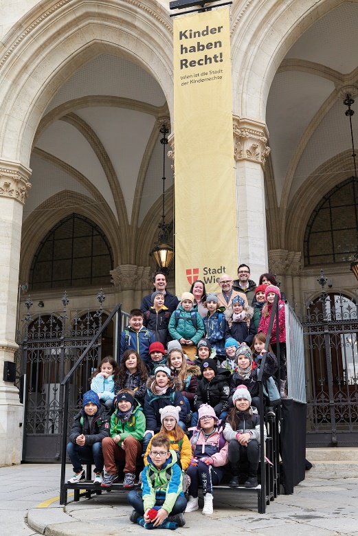 Am Wiener Rathaus wurde, gemeinsam mit Vizebürgermeister Christoph Wiederkehr und Schüler*innen, die Kinderrechte-Fahne gehisst.
