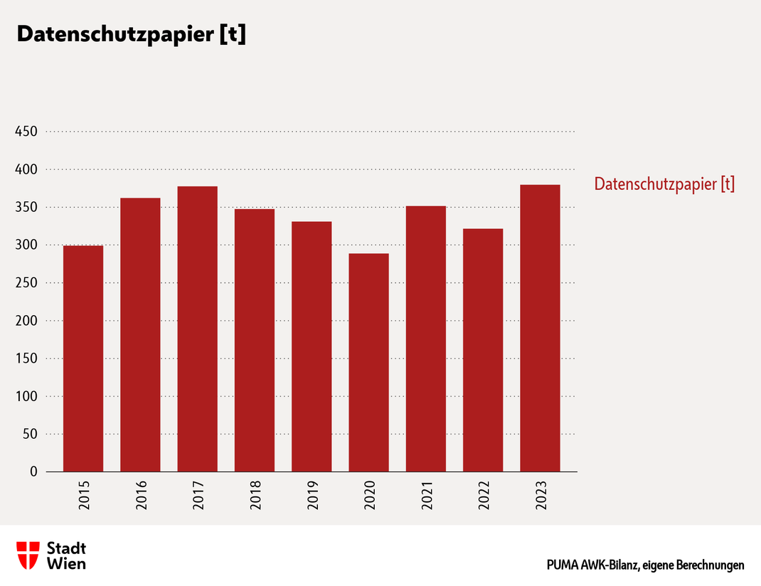 Die Abfallfraktion Altpapier setzt sich aus herkömmlichem Altpapier (z.B. fehlerhafte Ausdrucke, Broschüren, Zeitungen) und dem extra als Datenschutzpapier zu entsorgendem Papier zusammen (siehe Grafik „Altpapier“ sowie Grafik „Datenschutzpapier“). Seit April 2020 übernahm die MA 48 die Entsorgung von Datenschutzpapier im Magistrat. Nach dem Einbruch 2020 sind die Werte beim Datenschutzpapier wieder auf dem früheren Niveau.
