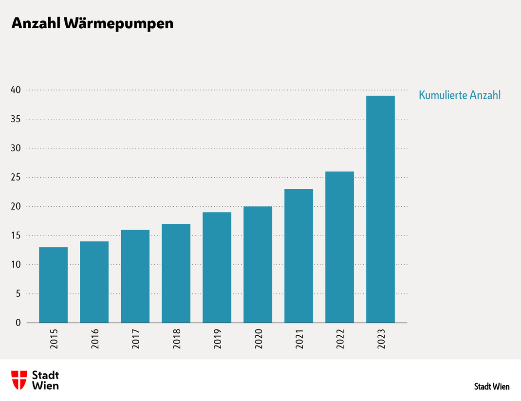 Im Magistrat begann die Technologie Wärmepumpe in den letzten Jahren nur langsam Fuß zu fassen. Durch die Bekanntmachung von Vorzeigeprojekten und im Rahmen von Veranstaltungen wurde viel Bewusstseinsbildung betrieben, um diese Technologie weiter zu forcieren. Denn die Wärmepumpe ist die Wärmetechnologie der Zukunft und hat auch große Bedeutung bei der Umrüstung von gasversorgten Gebäuden. Im Jahr 2023 konnte bereits ein vergleichsweise starker Anstieg verzeichnet werden. In Neubauprojekten wie beispielweise in Bildungseinrichtungen ist der Einsatz der Wärmepumpen bereits Standard.