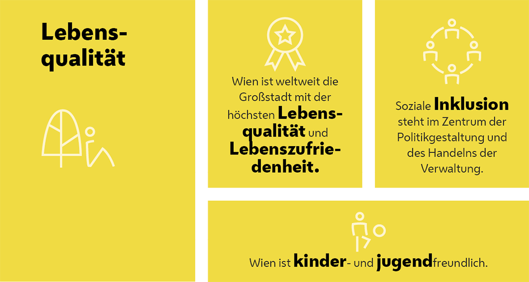 Lebensqualität ist kein Zufall. Wien ist bekannt als Stadt höchster Lebensqualität. Das ist vielen Jahrzehnten konsequenter Arbeit und vorausschauender Planung zu verdanken. Ausgezeichnete Infrastruktur mit gut ausgebautem und zuverlässigem Öffi-Netz, die gute Wasser- und Gesundheitsversorgung sowie vielfältige Bildungs-, Kultur- und Freizeitangebote tragen genauso dazu bei wie hochwertiger und leistbarer Wohnraum und eine gute Umweltqualität.