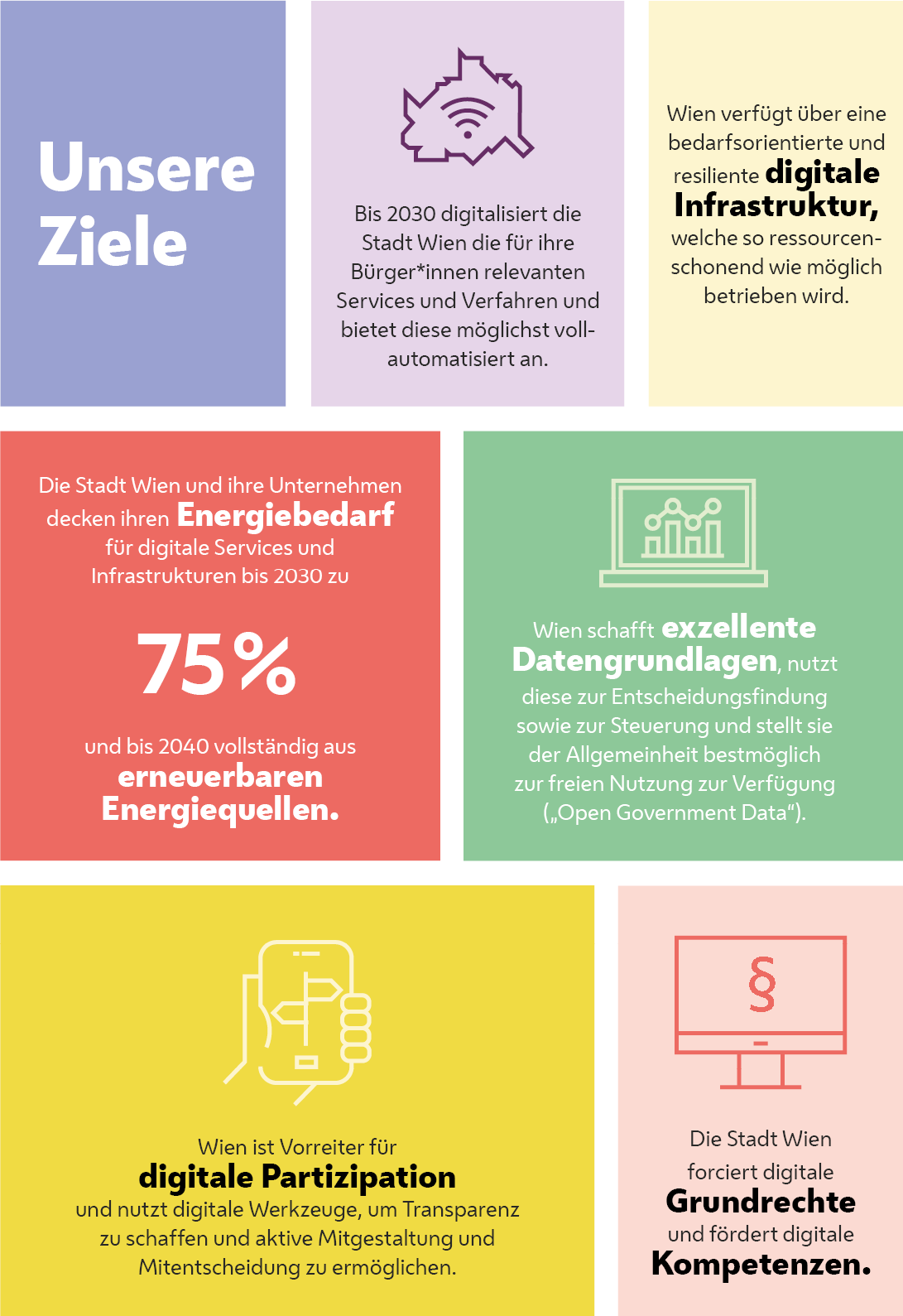Digitale Infrastrukturen vorausschauend planen und bereitstellen: Im Sinne einer „digitalen Daseinsvorsorge“ stellt die Stadt Wien sicher, dass die digitale Infrastruktur für Bürger*innen, Unternehmen und Wissenschaft auf dem Standard einer zeitgemäßen Stadtverwaltung sowie eines konkurrenzfähigen und ökologisch nachhaltigen Standorts gehalten wird.
