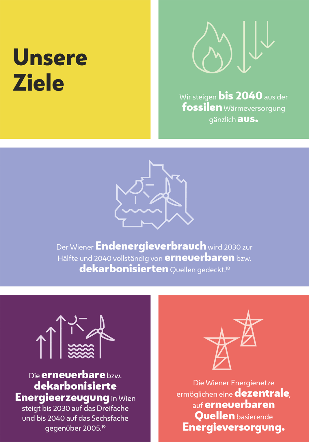 Parallel dazu treibt Wien die Umstellung auf erneuerbare Energieträger konsequent voran, insbesondere durch den Umstieg auf hocheffiziente Elektroantriebe und geteilte Mobilitätsangebote im Verkehrsbereich und auf eine Wärmeversorgung mit Fernwärme oder Wärmepumpen.