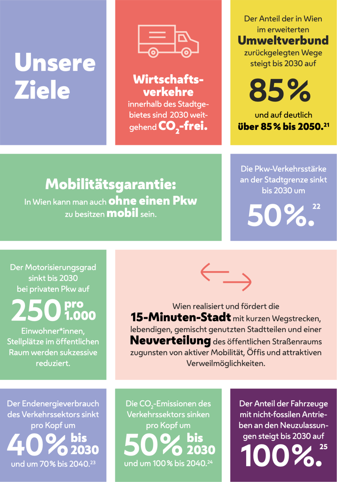 Stadtverträglicher und klimaneutraler Verkehr heißt, wo immer möglich den Mobilitätsbedarf zu verringern, Wege vom privaten Autoverkehr auf effiziente Verkehrsmittel zu verlagern und statt fossiler Treibstoffe auf CO2-freie Antriebe für Fahrzeuge aller Art umzusteigen. Mobilität in Wien muss auch bei anhaltendem Bevölkerungswachstum im Einklang mit den Klimazielen und dem Anspruch auf hohe Lebensqualität in allen Stadtquartieren erfolgen. Dabei gilt weiterhin das Prinzip der sozialen Inklusion und der leistbaren Mobilität für alle in Wien lebenden Menschen.