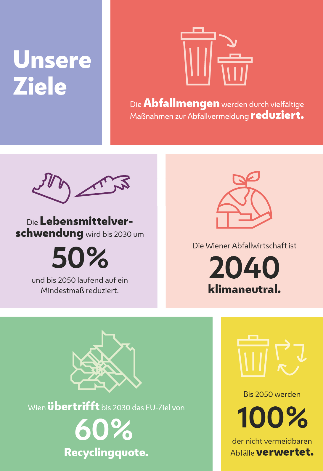 Weiterentwicklung und konsequente Umsetzung des Wiener Abfallvermeidungsprogramms: Ausbau des Reparaturnetzwerks Wien, Forcierung von Mehrwegprodukten und -verpackungen, Beratung von Betrieben bei Ressourcenschonung und Abfallvermeidung usw.