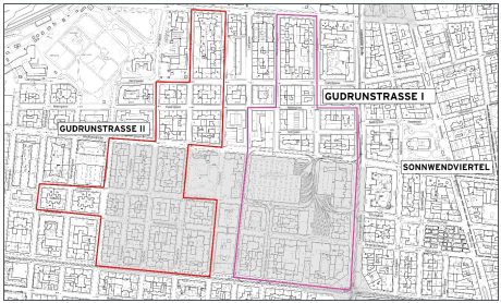 Bei der Definition der Blocksanierungsgebiete wurde das Gebiet aufgrund seiner Größe in einen westlichen (Gudrunstraße II) und in einen östlichen Teil (Gudrunstraße I) aufgeteilt.