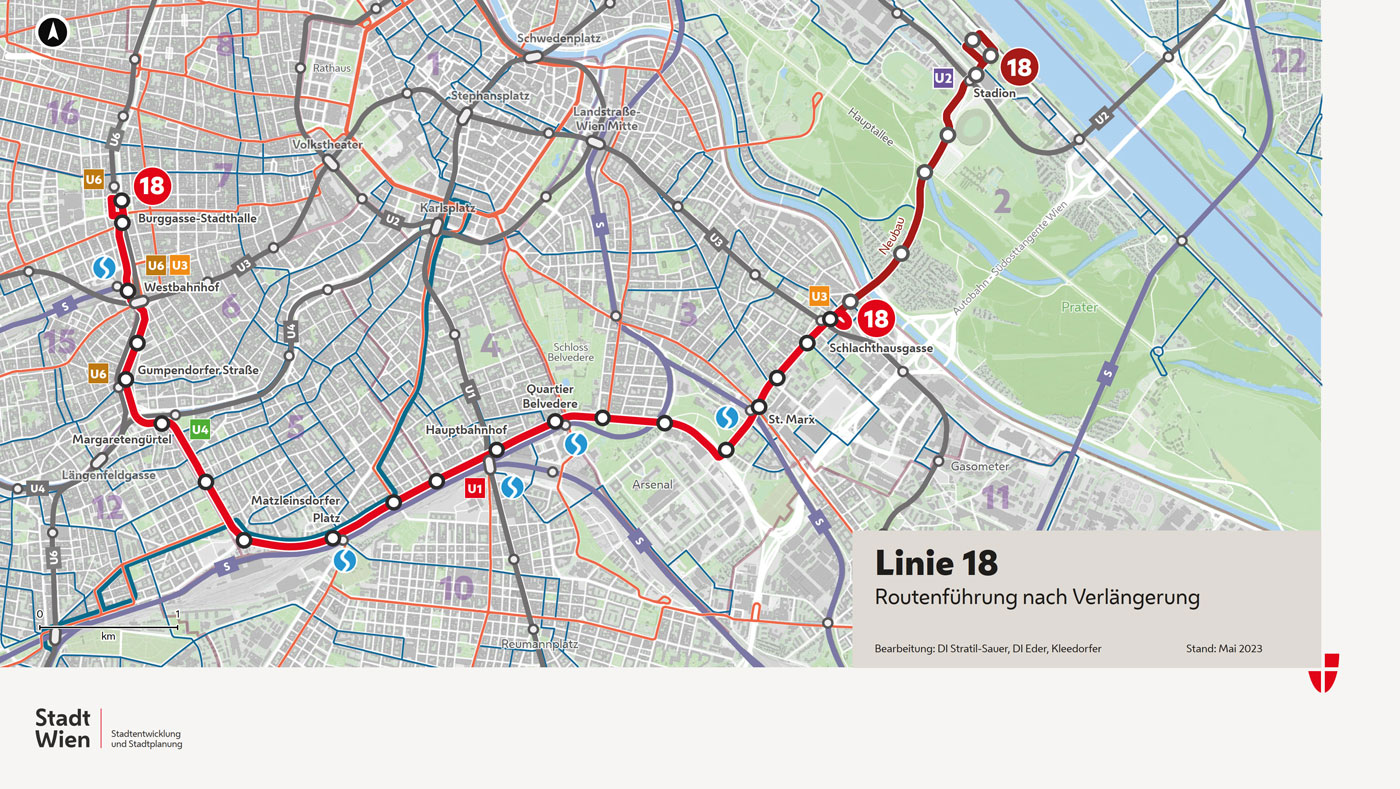 - Start für den Ausbau der Straßenbahnlinie: Die 18er-Linie wird von der U3-Station Schlachthausgasse bis zur U2-Station Stadion verlängert. Damit entstehen 7 neue Haltestellen.