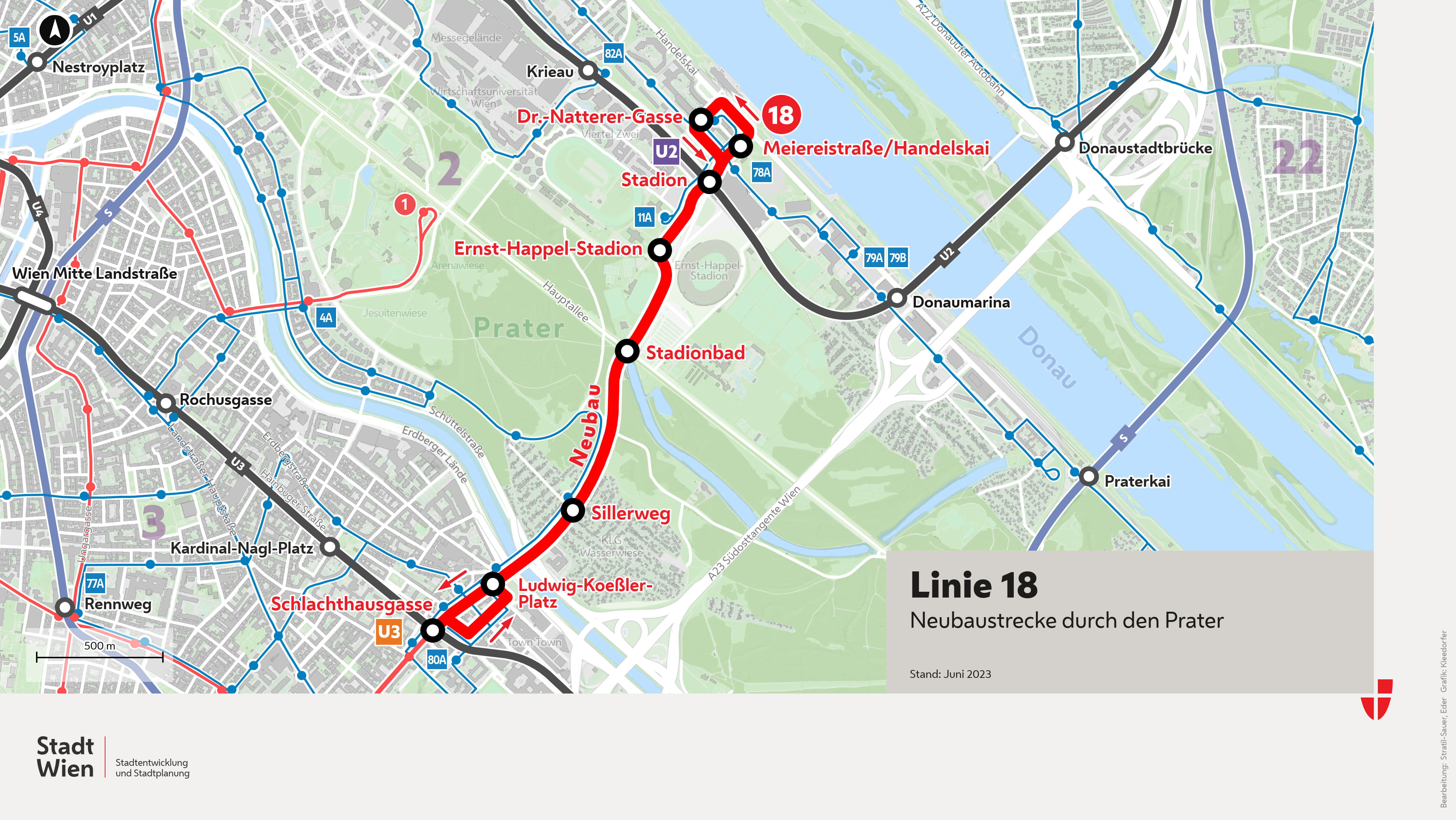 Ab Herbst 2026 wird die Linie 18 bis in die Leopoldstadt fahren. Dazu baut die Stadt Wien von der bisherigen Endstation bei der U3-Station Schlachthausgasse bis zur U2-Station Stadion eine neue Straßenbahnstrecke durch den Prater.