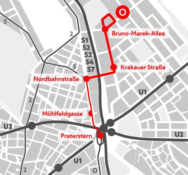 Auf dem Gelände des ehemaligen Frachtenbahnhofs Nordbahnhof im 2. Bezirk entsteht ein neuer Stadtteil. Zur optimalen Erschließung dieses bedeutenden Stadtentwicklungsgebiets wurde die Straßenbahnlinie O von ihrer bisherigen Endstation am Praterstern in den neuen Stadtteil verlängert.