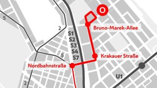 Die nächste Haltestelle befindet sich in der Bruno-Marek-Allee unmittelbar nach der Kreuzung mit der Straße Am Tabor. Die weitere Strecke der Linie O verläuft in der Bruno-Marek-Allee im Mischverkehr mit dem Kfz-Verkehr. Die Bruno-Marek-Allee verfügt als zentrale Geschäftsachse des Nordbahnviertels über besonders großzügige Gehsteige. Für den Radverkehr wurden beidseitige Radfahrstreifen vorgesehen.