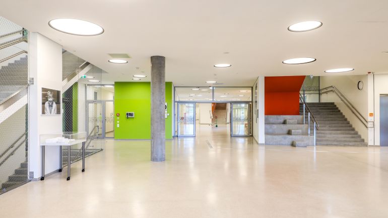 Von der Eingangshalle gelangen die Schülerinnen und Schüler in ihre Bildungsbereiche.