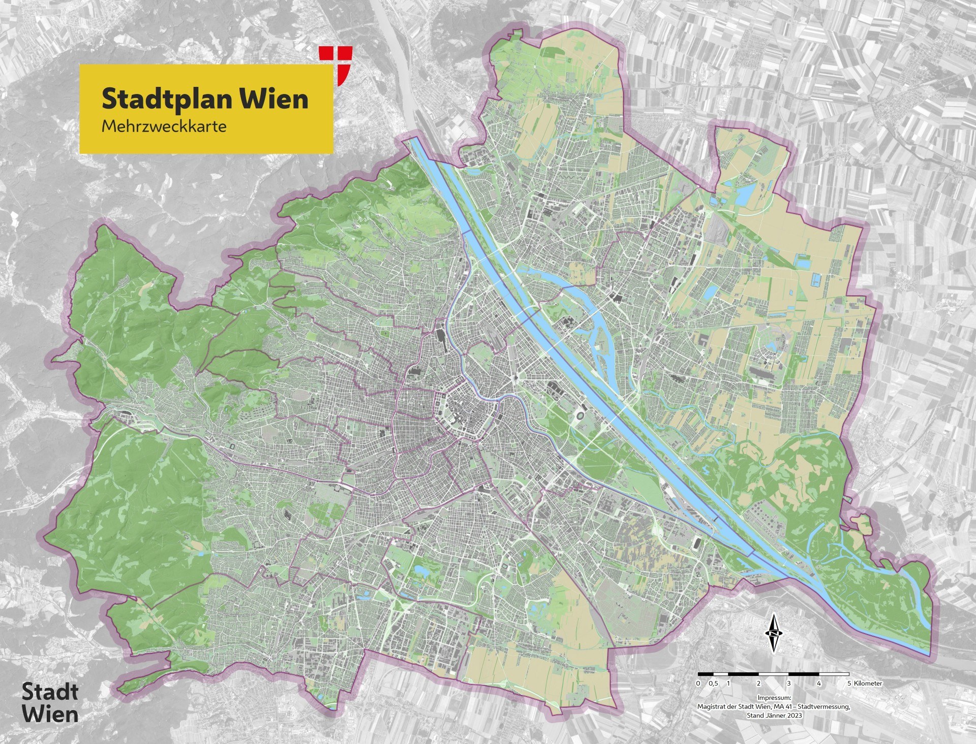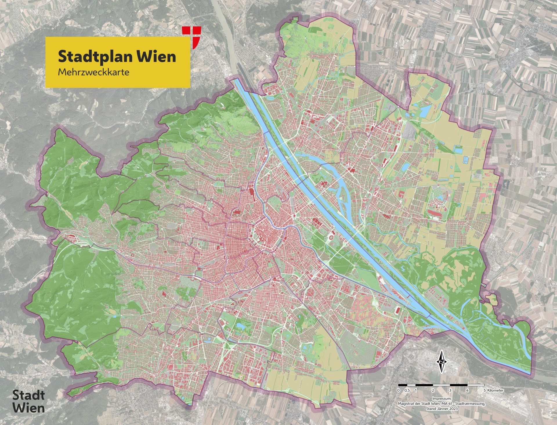 Grundlagedaten für die Wienübersichten sind die Flächen-Mehrzweckkarte, Orthofoto, Oberflächenmodell-Schummerung und Bezirks- und Landesgrenzen.
