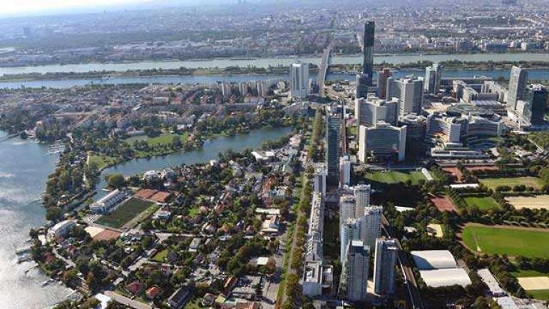 Blick über die Donau City und Alte Donau Richtung Innenstadt