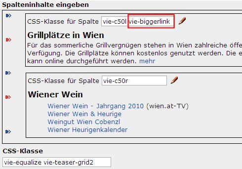 Bei Rasterblöcken mit Text muss bei der entsprechenden Spalte zusätzlich die CSS-Klasse vie-biggerlink eingegeben werden. Dadurch ist nicht nur der “mehr”-Link klickbar, sondern auch Bild, Überschrift und Text des Rasterblockes.