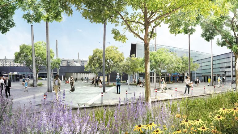 Umgeben wird der neue Platz von einem 2,5 Meter breiten und 1.400 Quadratmeter umfassenden begrünten Ring, der aus leicht erhöhten Pflanzbeeten besteht. Die Beete wurden mit robusten, dem Stadtklima angepassten Ziergräsern und Kleinsträuchern bestückt. Ergänzende Bepflanzungen mit hitzeresistenten Bäumen und Gräsern tragen dazu bei, den Platz vor zu starker Erwärmung zu schützen. Die Grünflächen wurden auf 8.000 Quadratmeter nahezu verdoppelt, auch die Anzahl der Bäume wurde verdoppelt. Insgesamt spenden 101 Bäume Schatten. Angewendet wird auch das Schwammstadt-Prinzip.