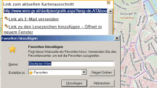 Zu sämtlichen ViennaGIS Internet Applikationen kann der Applikationszustand (Themenauswahl, geografischer Ausschnitt) mit einem selbst erzeugten Link abgespeichert werden. Dieser kann auch als Lesezeichen im Browser hinzugefügt oder als E-Mail versendet werden.